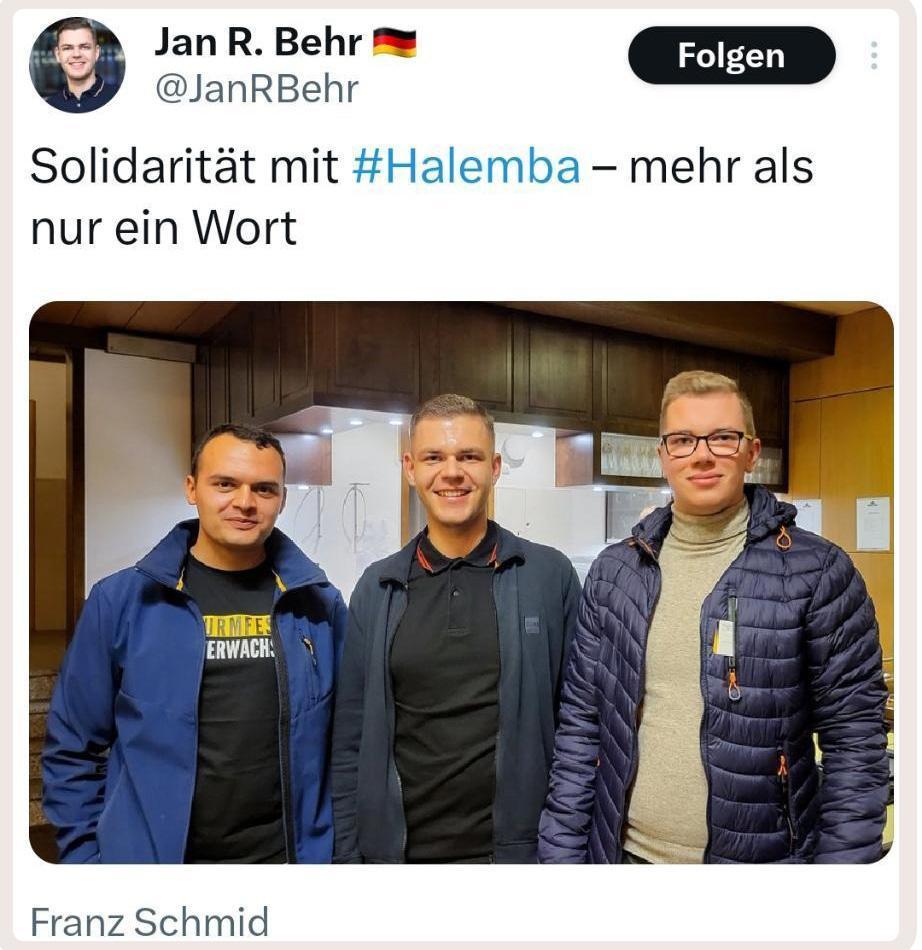 Schmid nahm persönlich an Treffen der IB Schwaben teil, die im Internet als „Reconquista 21“ agiert, bei denen der bekannte Rechtsextreme Martin Sellner und auch der bayrische Landtagsabgeordnete Halemba anwesend waren. Gegen Daniel Halemba wird seit Oktober 2023 wegen Volksverhetzung ermittelt. Nach einer Durchsuchung gab die Staatsanwaltschaft Würzburg gab bekannt, dass in seinem Zimmer ein SS-Befehel von Heinrich Himmler an prominenter Stelle zu finden wahr. Martin Sellner, Vordenker der „Remigration“, ist bekannt für seine rassistischen, antisemitischen und antifeministische Positionen sowie aus der Correktiv-Recherche.